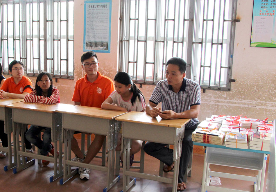 方銀城校長(右一)給志愿者們講述他與峰頭小學的故事